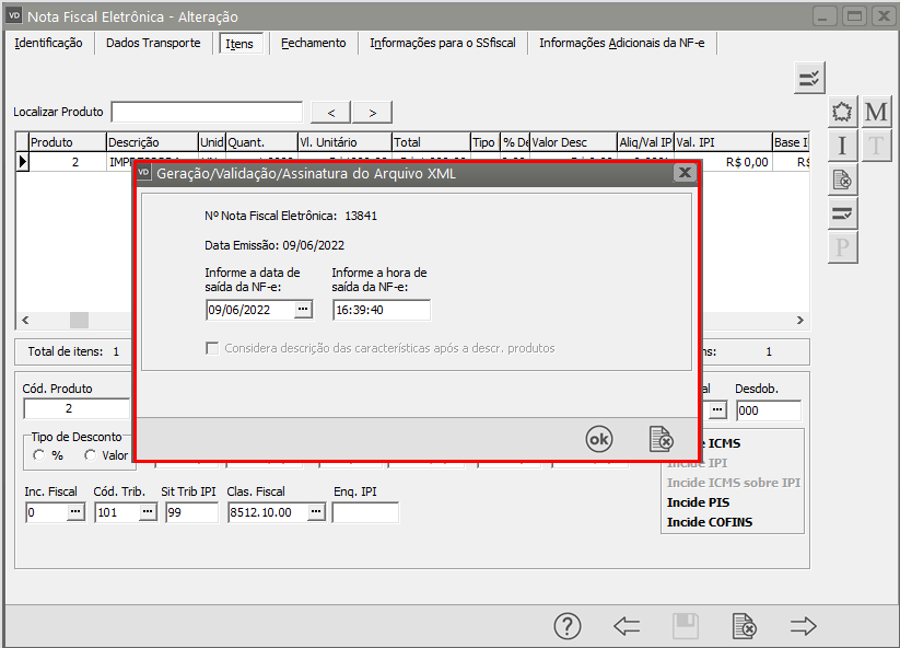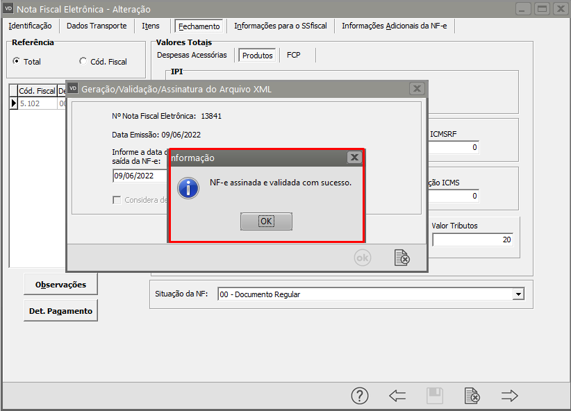 Se as informações estiverem corretamente cadastradas a NF-e será assinada e validada com sucesso.