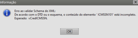 De acordo com o DTD ou o esquema, o conteúdo do elemento “ICMSSN101” está incompleto. Esperado: vCredICMSSN