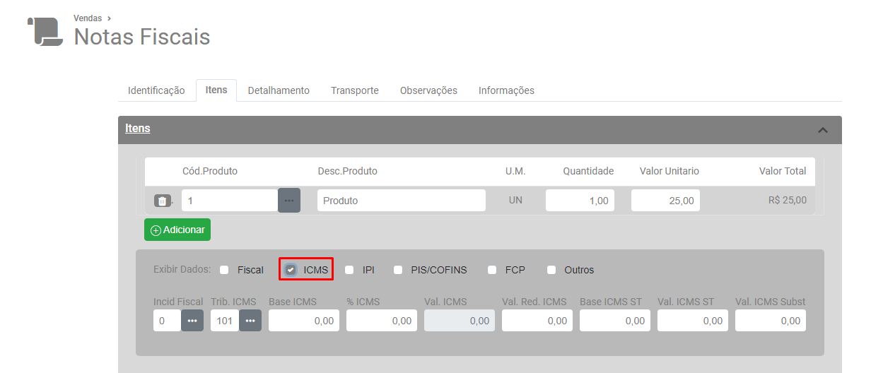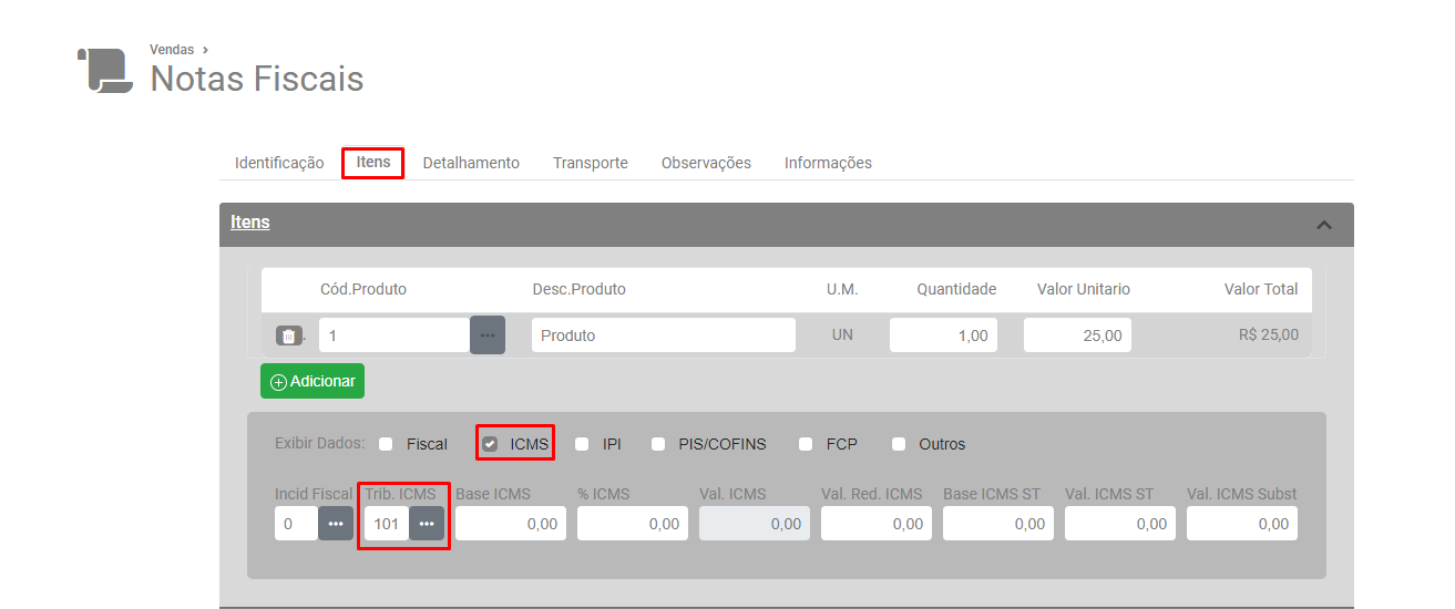 Verifique a aba Itens, se o CFOP utilizado na NF-e incide ou não ICMS.