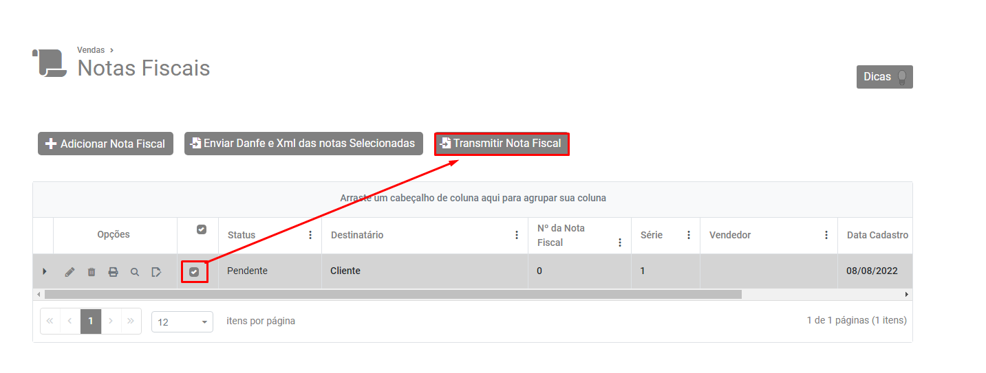Em seguida, selecione a NF-e e clique no botão Transmitir Nota Fiscal