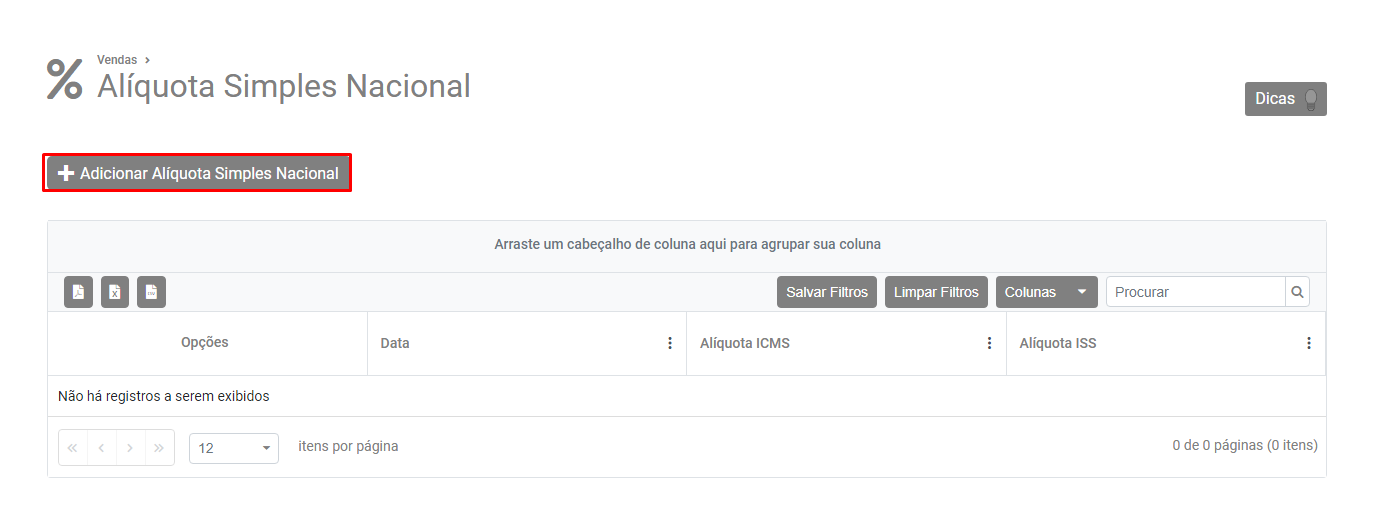 Clique em Adicionar Alíquota Simples Nacional