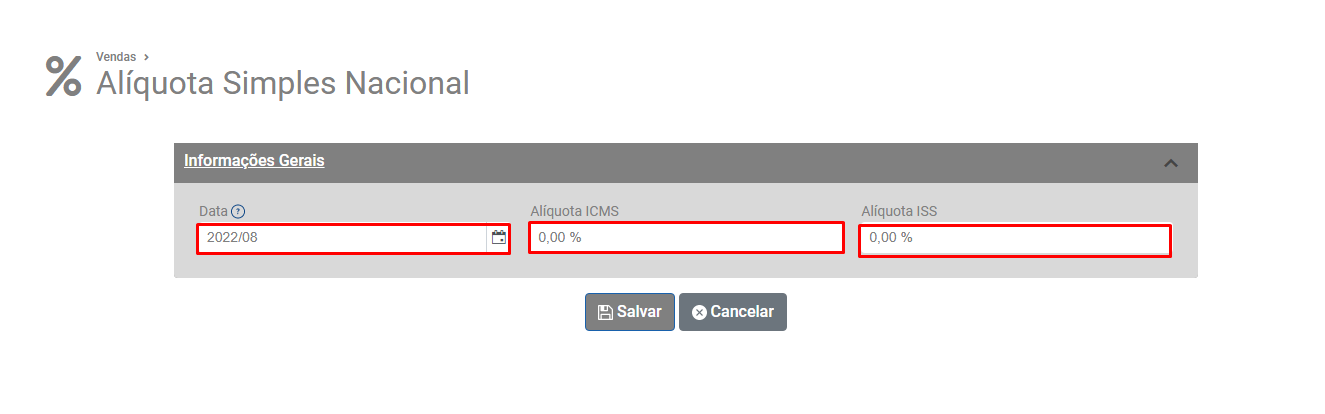 Informar a alíquota de crédito do Simples Nacional.