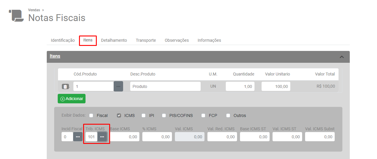 Acesse a aba Itens e pesquise novamente pelo código de tributação do ICMS que tem aproveitamento de crédito do ICMS ou do ISS.