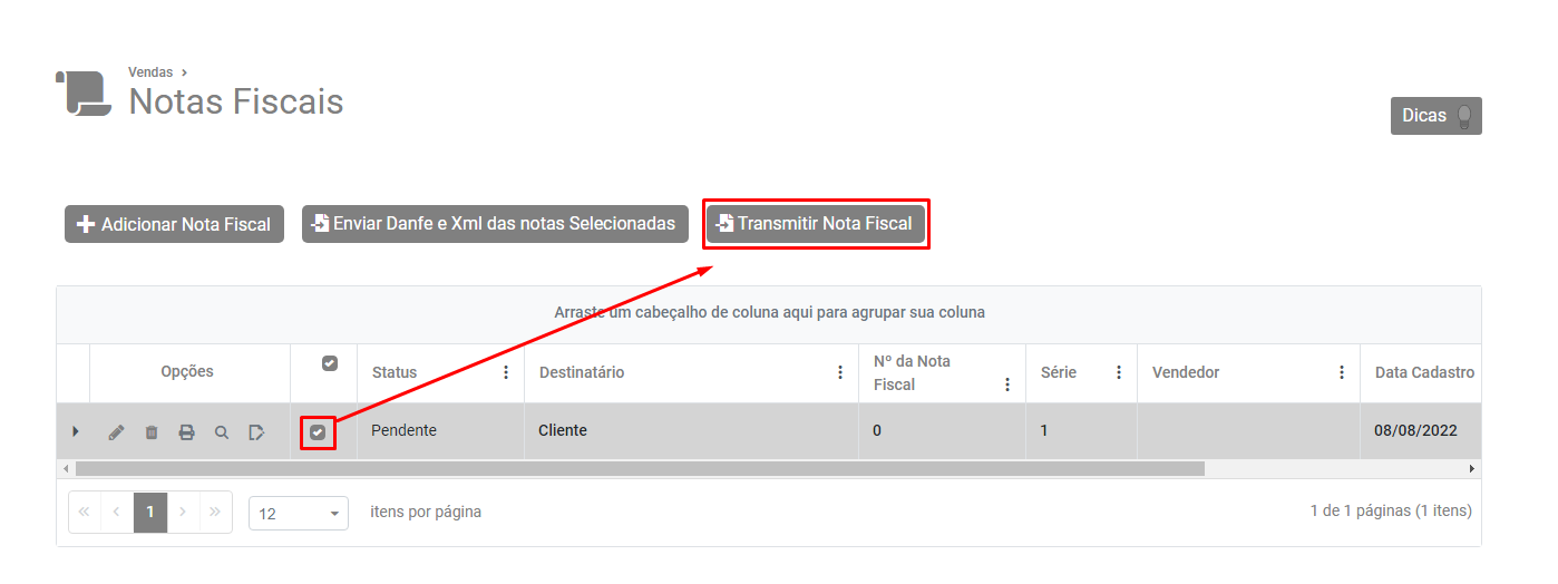 Selecione a Nota e clique no botão Transmitir Nota Fiscal Eletrônica.