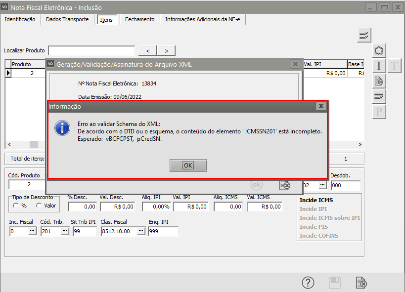 Ao validar Schema do XML: De acordo com o DTD ou o esquema, o conteúdo do elemento ' ICMSSN201' está incompleto. Esperado: vBCFCPST, pCredSN.