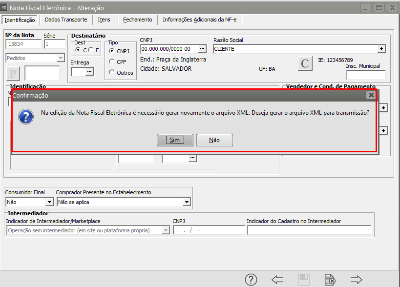 Salve novamente a nota e o Sistema irá questionar se você deseja gerar o arquivo XML para transmissão, clique em SIM.