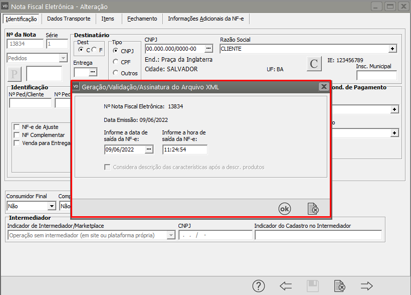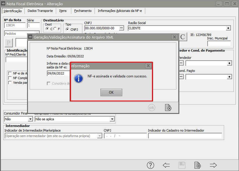 O Sistema apresentará a tela com as informações do XML gerado, clique em OK