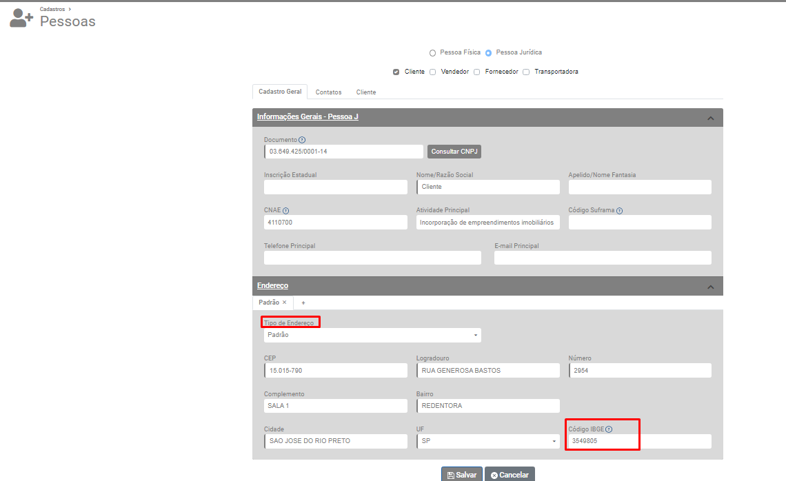Pesquise pelo cliente e edite o cadastro do mesmo. Confira as informações cadastradas para cada endereço cadastrado para o cliente, confirma também o Bairro e o código da cidade do IBGE dos endereços.