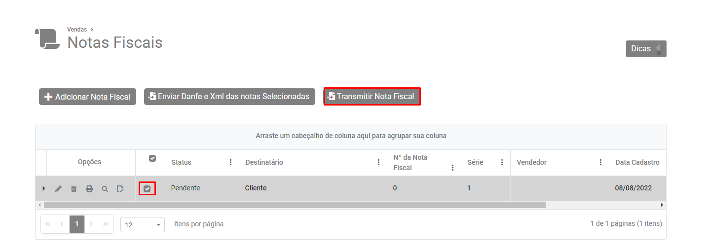 Em seguida selecione a Nota e clique no botão Transmitir Nota Fiscal