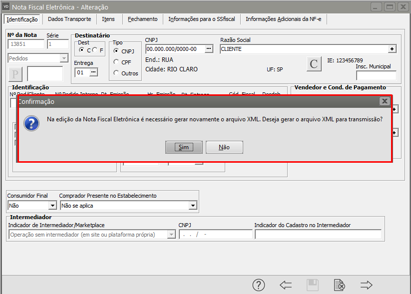 Em seguida Salve a NF-e, o Sistema irá questionar se você deseja gerar um novo XML, clique em SIM.