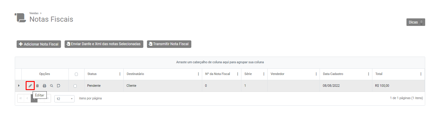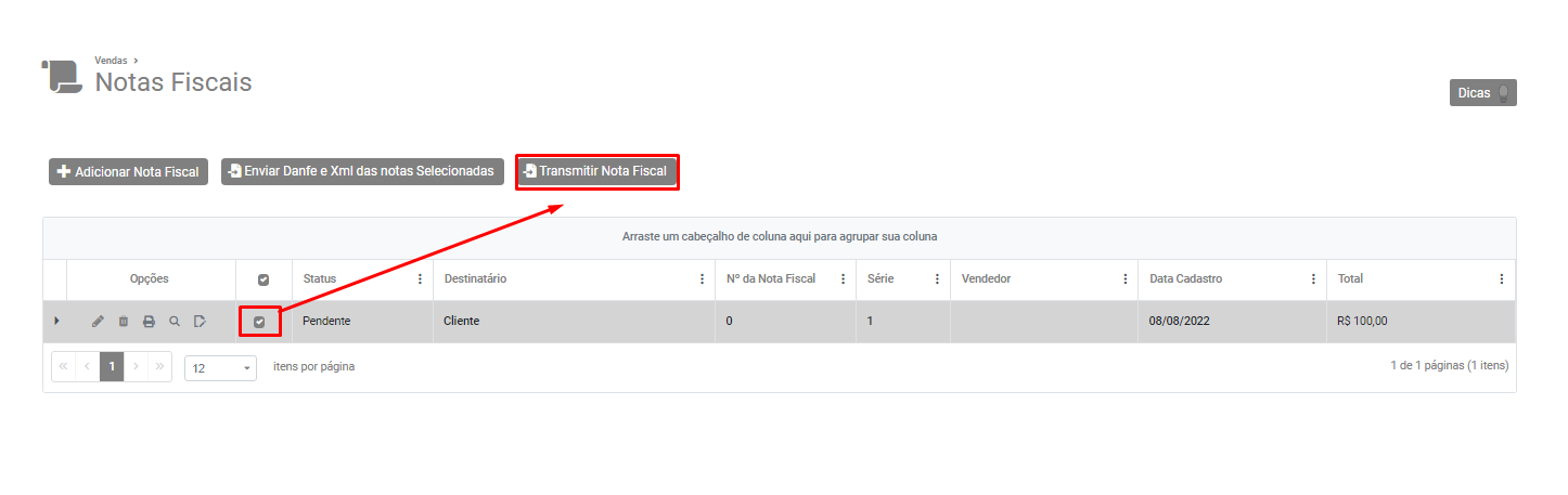 Selecione a Nota e clique no botão Transmitir Nota Fiscal.