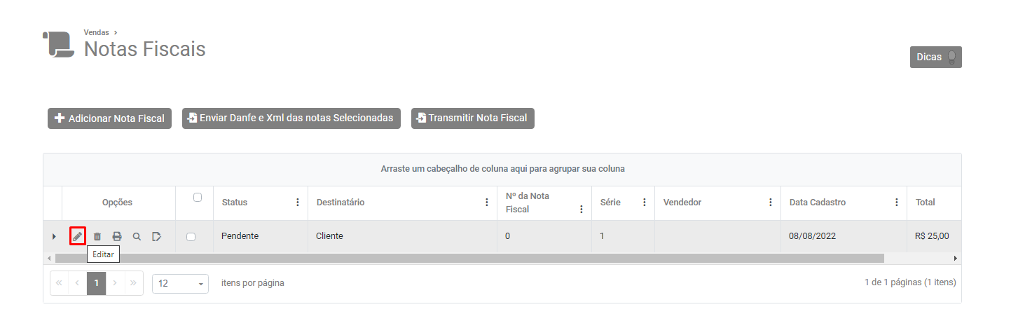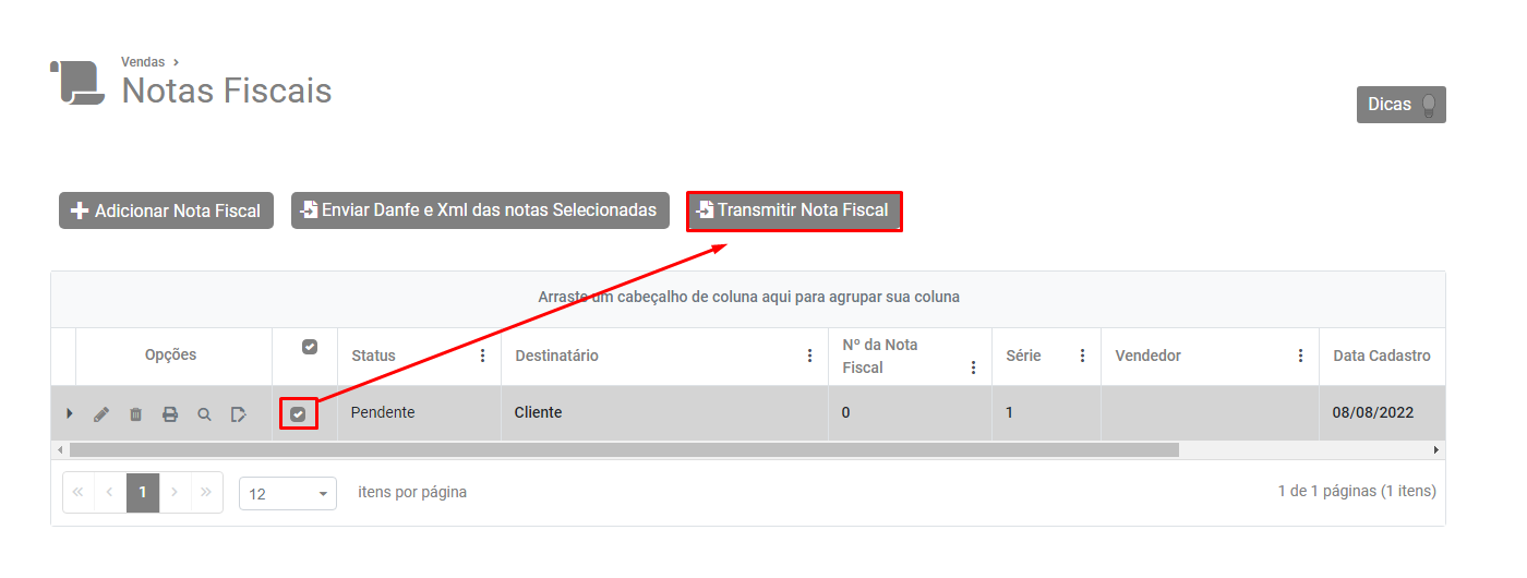 Selecione a Nota e clique no botão Transmitir Nota Fiscal.