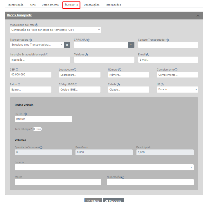 Em seguida, acesse a aba Transporte e confira todas as informações cadastrada