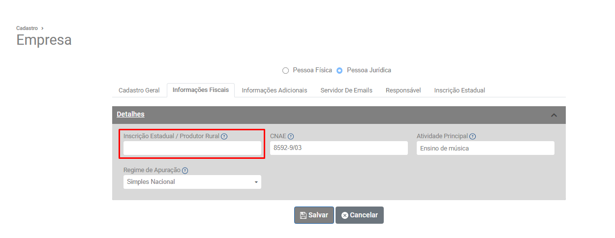 Em seguida edite a empresa e acesse a aba Informações Fiscais, verifique se o campo Inscrição Estadual está corretamente preenchido, faça a correção necessária e salve o cadastro.