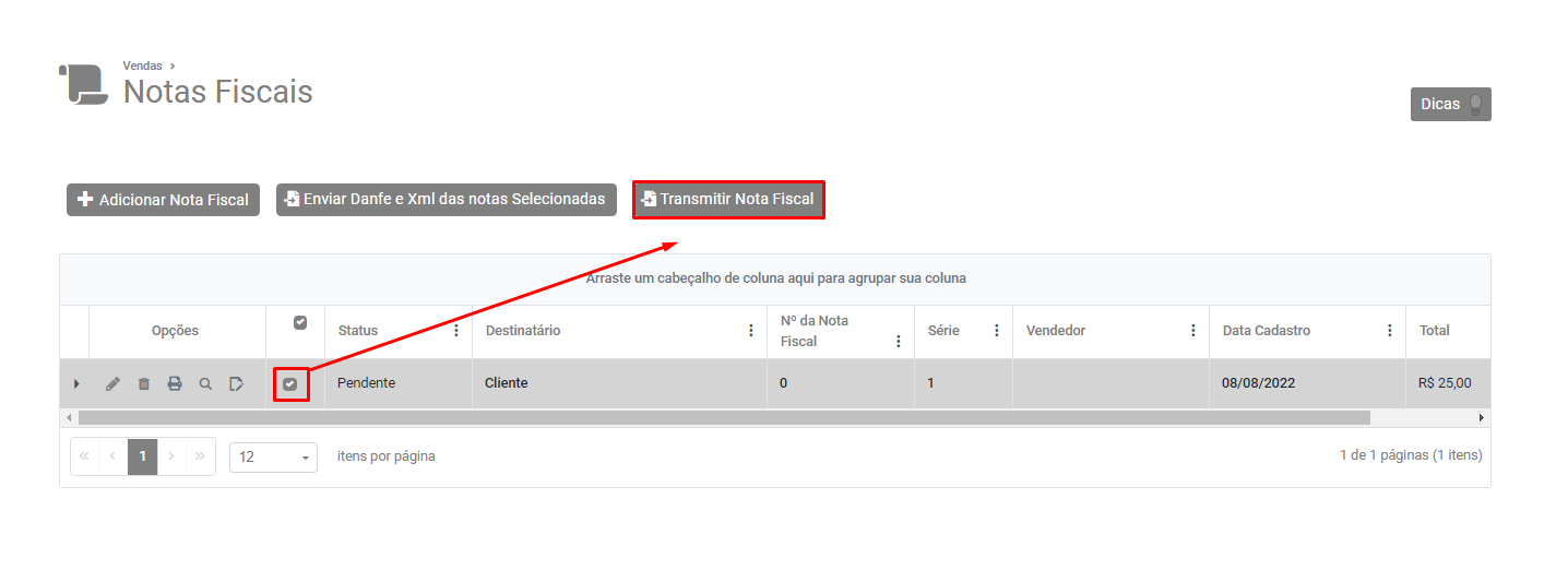 Agora, selecione a Nota e clique no botão Transmitir Nota Fiscal