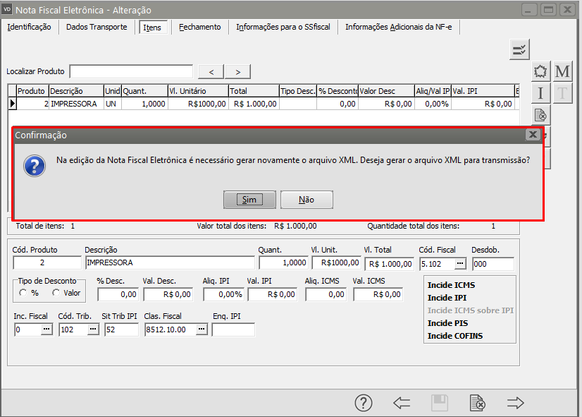 Depois de corrigidas as informações divergentes, salve a NF-e e o Sistema irá questionar se você deseja gerar um novo XML para Transmissão, clique em SIM.