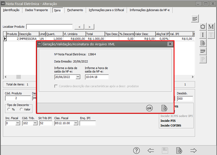 Se todas as informações estiverem corretamente cadastradas, a NF-e será assinada e validada com sucesso.