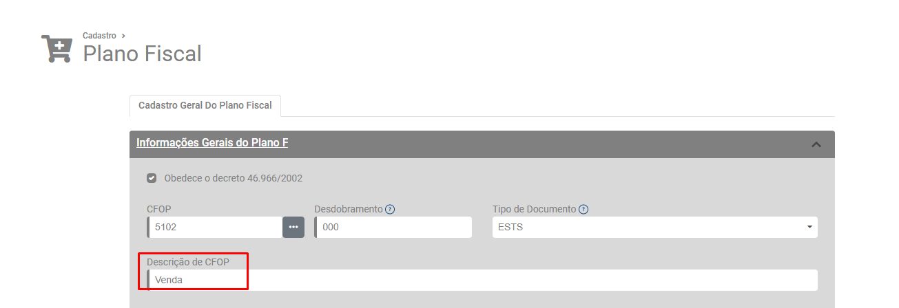 Descrição (Natureza da Operação) do Código Fiscal é inválida. Será aberto o cadastro do Plano Fiscal para correção.
