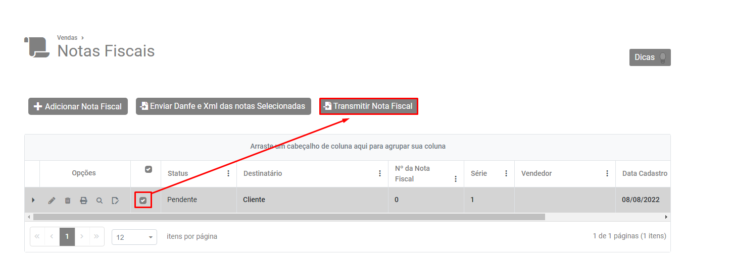Salve novamente a NFe (para que o Sistema atualize as informações) e em seguida selecione a nota e clique no botão Transmitir Nota Fiscal.
