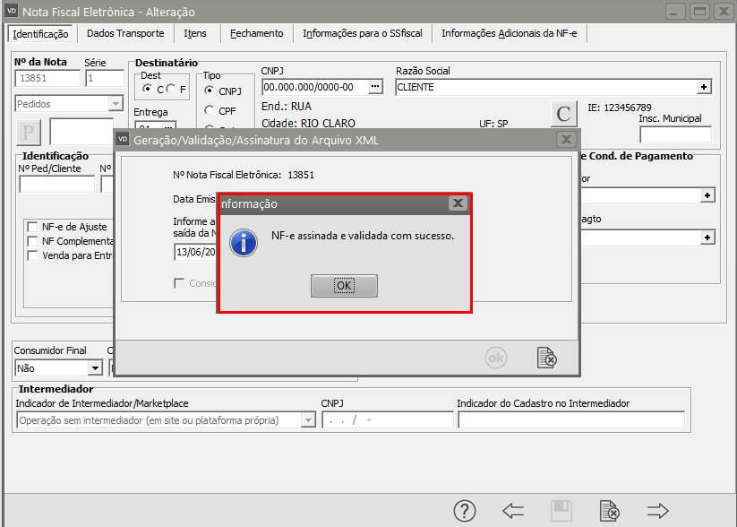 Se todas as informações estiverem corretamente cadastradas, a NF-e será assinada e validada com sucesso.
