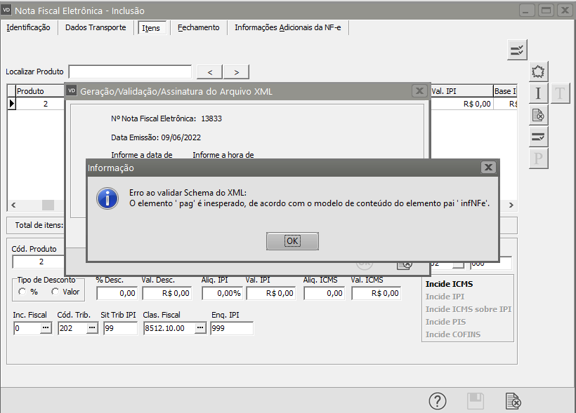 O elemento ' pag' é inesperado, de acordo com o modelo de conteúdo do elemento pai "infNFe"