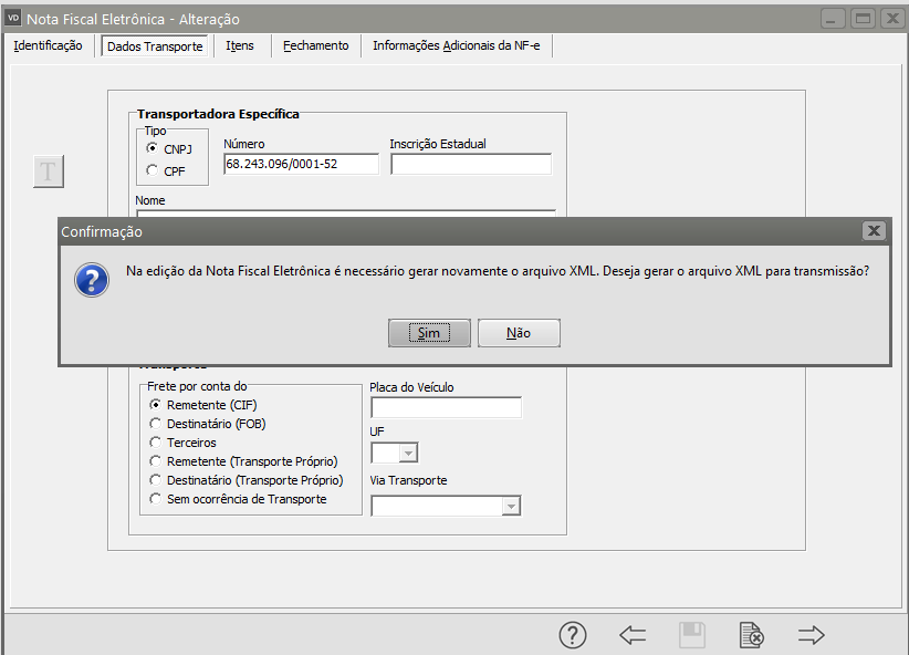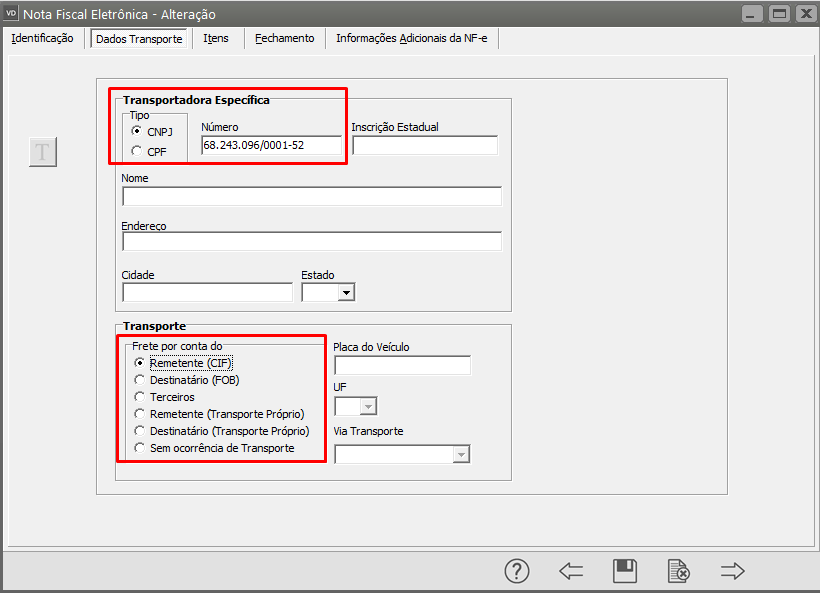 Informar os dados do Transporte