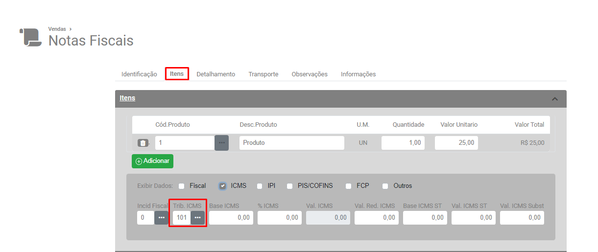Acesse a aba Itens e verifique qual é o Código de Tributação que deve ser utilizado e faça a alteração.
