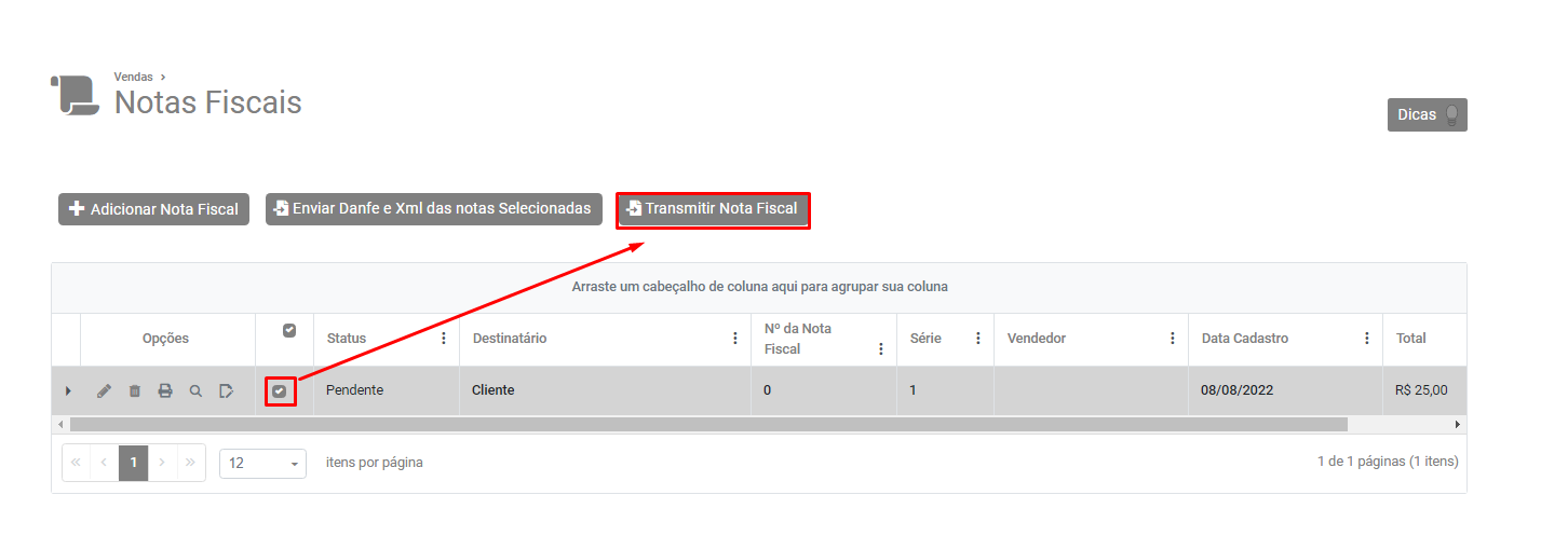 Após a correção salve a NF-e, em seguida selecione a nota e clique no botão Transmitir Nota Fiscal
