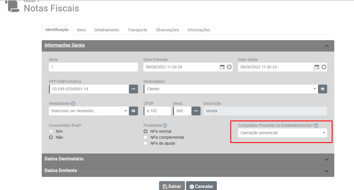 Verificar na aba Identificação Cadastro da NF-e, campo Comprador Presente no Estabelecimento