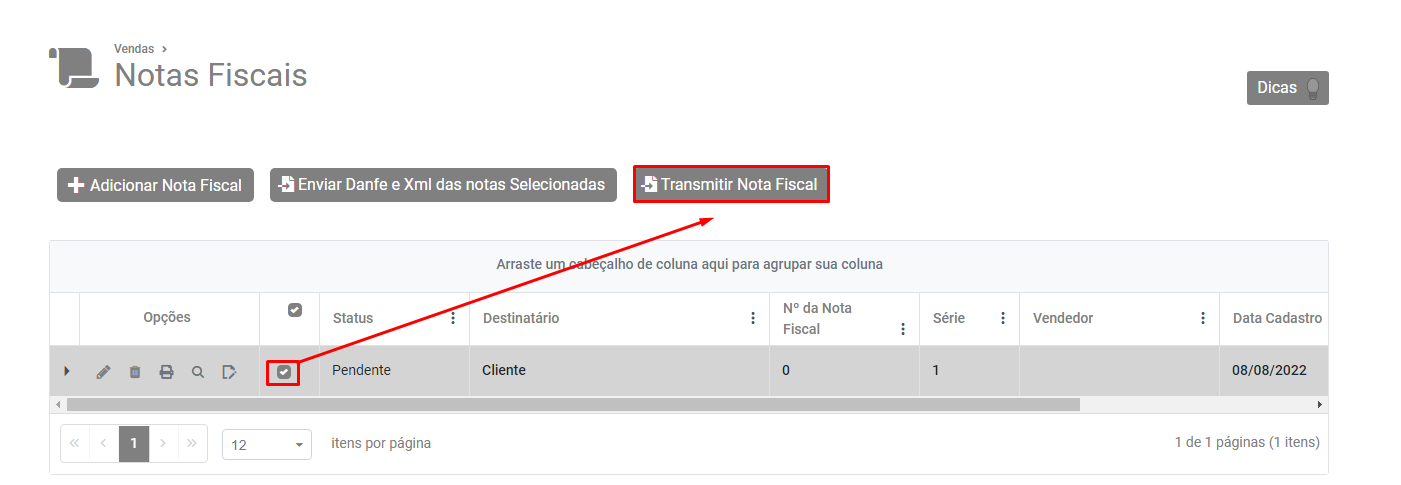 Salve a Nota Fiscal Eletrônica e faça a seleção da mesma no Grid, em seguida clique em Transmitir Nota Fiscal.