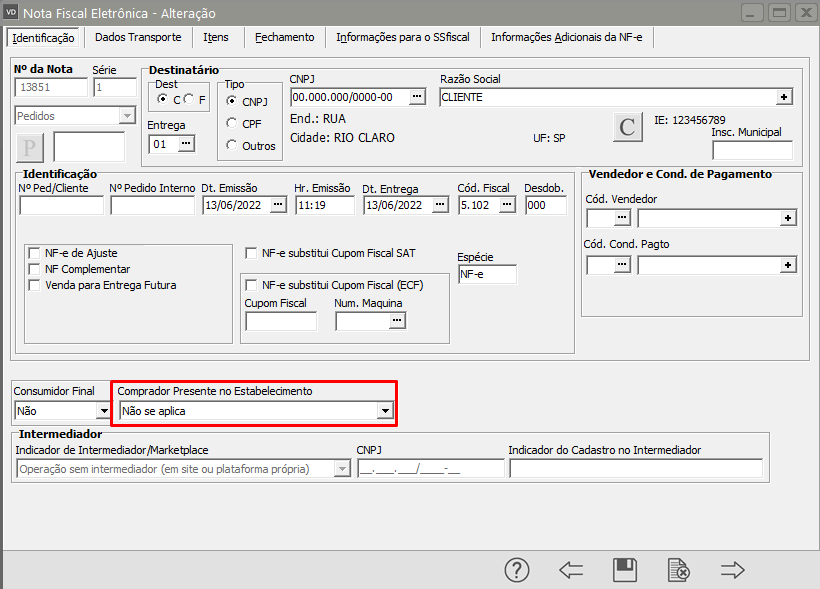 Na aba Identificação informe corretamente o campo Comprador Presente no Estabelecimento.