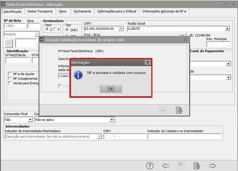 Se todas as informações estiverem corretamente cadastradas a NF-e será assinada e validada com sucesso.