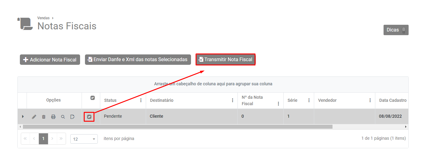 Selecione a NFe, no grid de Notas cadastradas e clique no botão Transmitir Nota Fiscal.