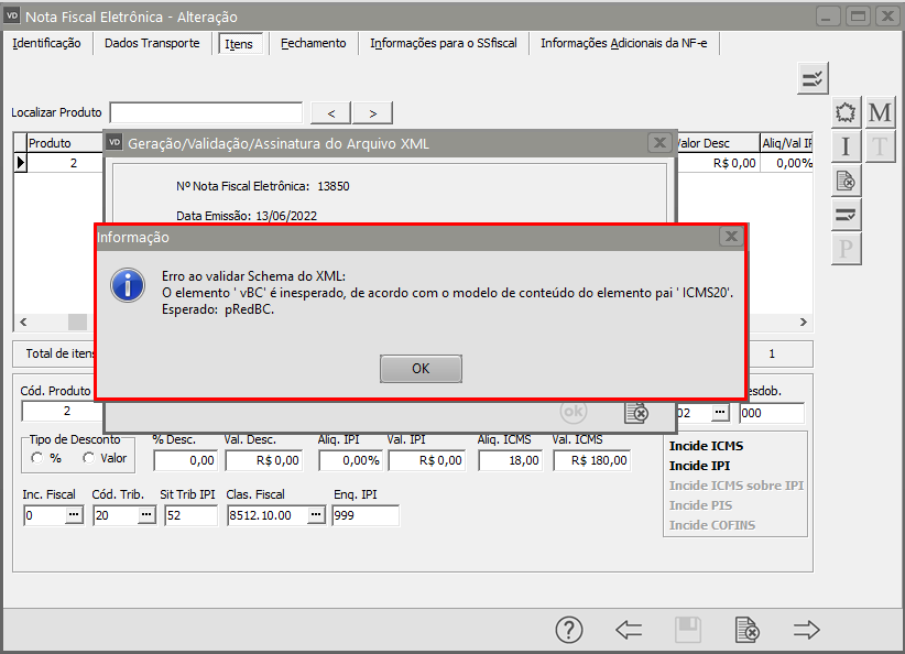 O elemento 'vBC' é inesperado, de acordo o modelo de conteúdo do elemento pai ' ICMS20'. Esperado: pRedBC
