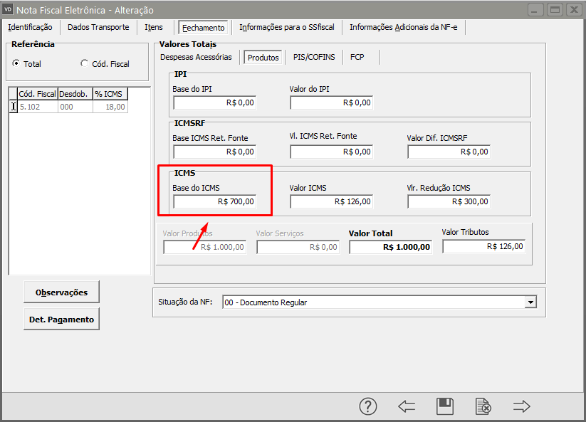 Quando for apresentada a mensagem se deseja atualizar as informações por Estado, clique em Sim e em seguida verifique na aba Fechamento, se a Redução na Base de Cálculo do ICMS foi calculada.