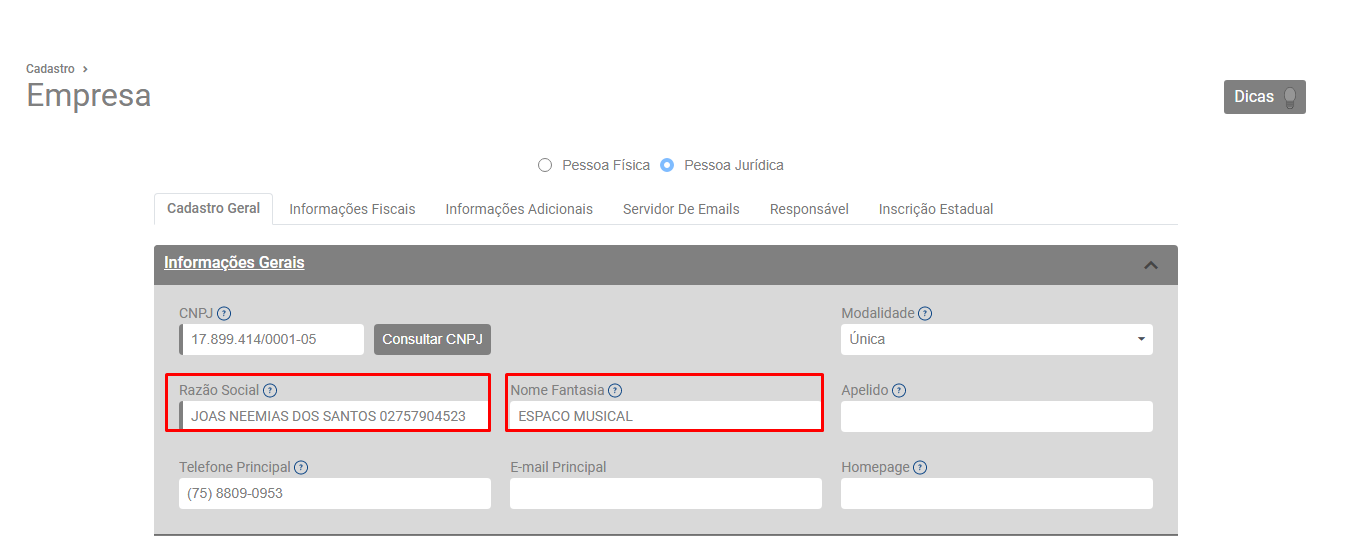 Confira e corrija as informações do campo Razão Social e Nome de Fantasia. Após a correção salve o cadastro.