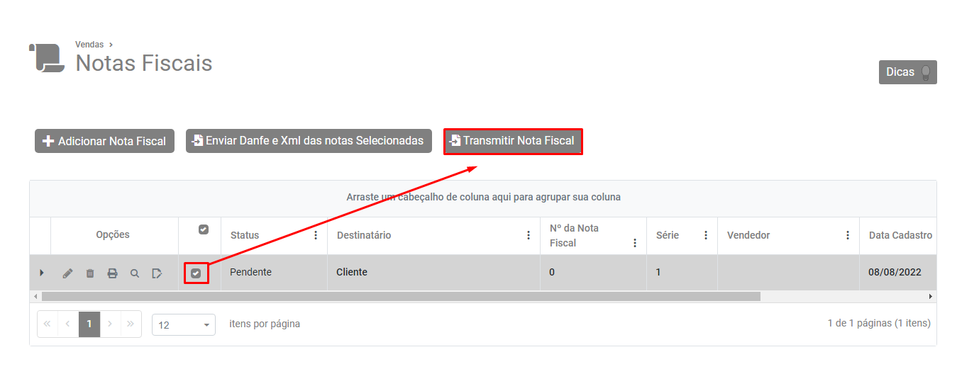 Em seguida Selecione a Nota e clique no botão Transmitir Nota Fiscal.