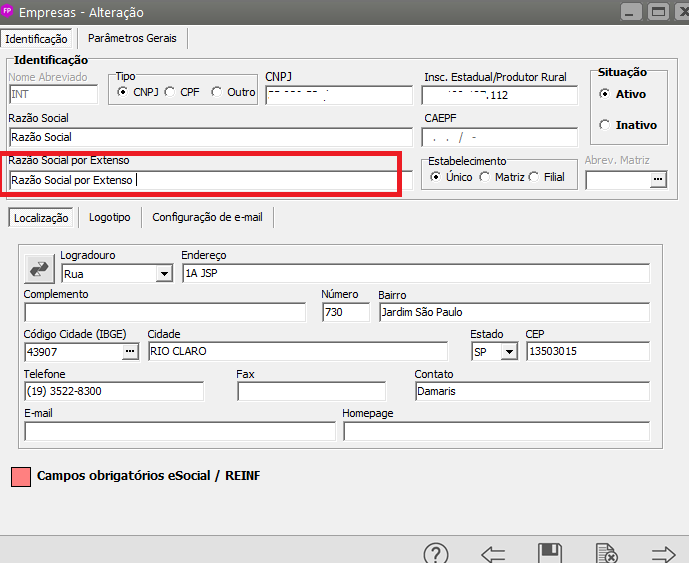Acessar os Dados Cadastrais da Empresa e informar a Razão Social por extenso.