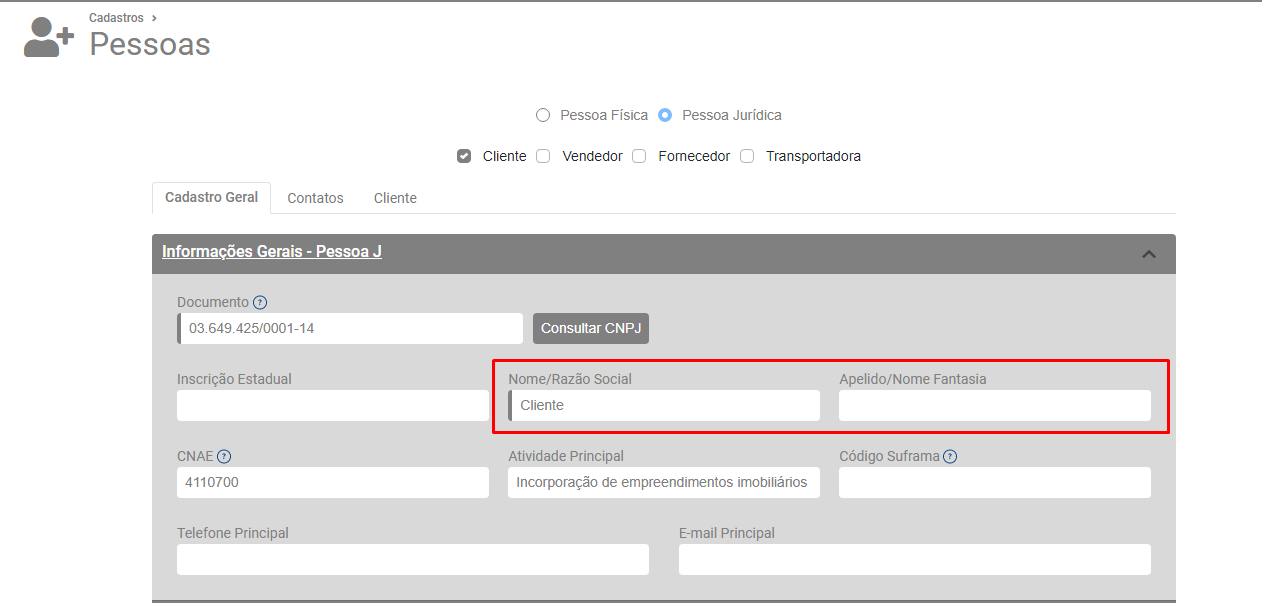 Confira na aba Cadastro Geral se a Razão Social do Cliente está corretamente cadastrada.