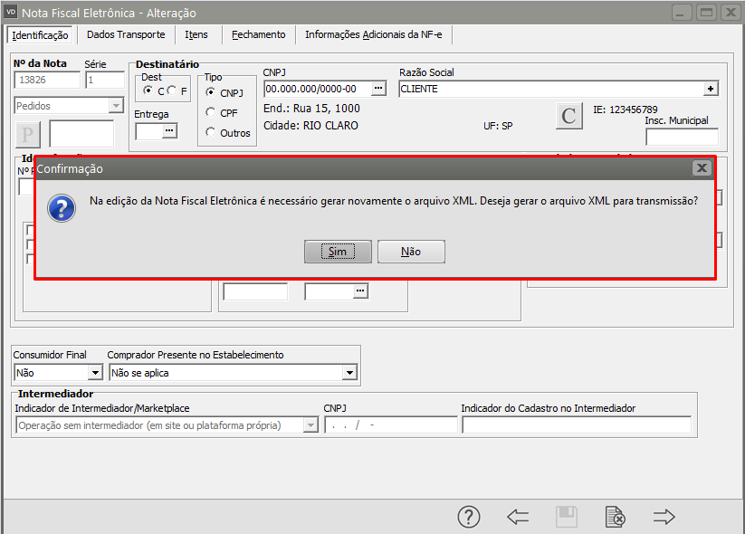 Salve o cadastro do cliente e acesse o menu Movimentação>Nota Fiscal Eletrônica>Manutenção, pesquise pela NF-e e clique na seta Avança, em seguida edite a Nota e procure novamente pelo cliente (para que o sistema atualize as informações alteradas), em seguida salve a NF-e e o Sistema irá questionar se você deseja gerar um novo XML.
