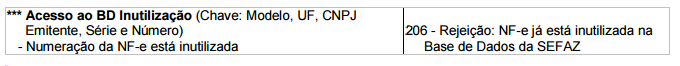 Correção: foi reutilizada a numeração de uma faixa numérica que já havia sido inutilizada/cancelada ou que está autorizada, na emissão de uma NF-e. Nessa situação, a NF-e será rejeitada pelo motivo 206.