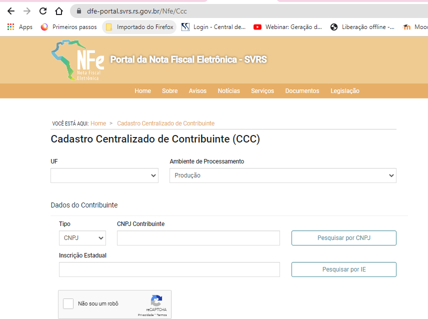 ou no Cadastro Centralizado de Contribuintes através do link https://dfe-portal.svrs.rs.gov.br/Nfe/Ccc