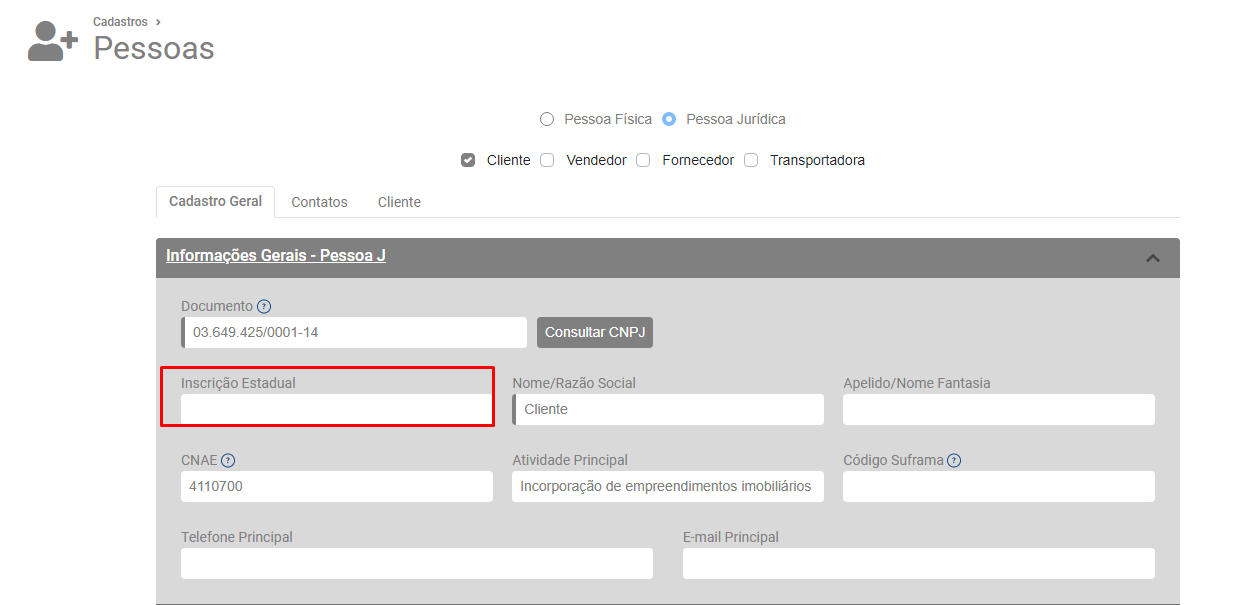 Acesse a aba Cadastro Geral e corrija a informação digitada no campo Inscrição Estadual, em seguida salve o cadastro.