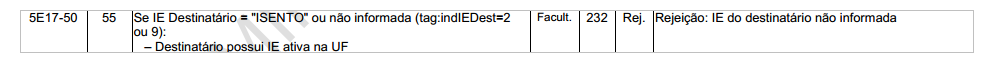 Foi emitida uma NF-e para um Destinatário Isento e com Inscrição Estadual ativa, porém a mesma não foi informada. Nessa situação, a NF-e será rejeitada pelo motivo 232.