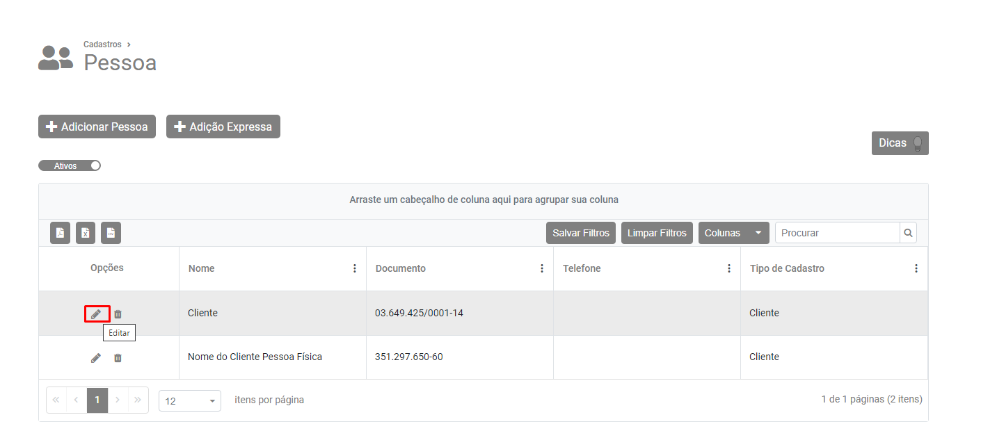 Em seguida acesse o Cadastro do Cliente (destinatário da nota fiscal eletrônica que foi rejeitada), no menu Vendas>Pessoas