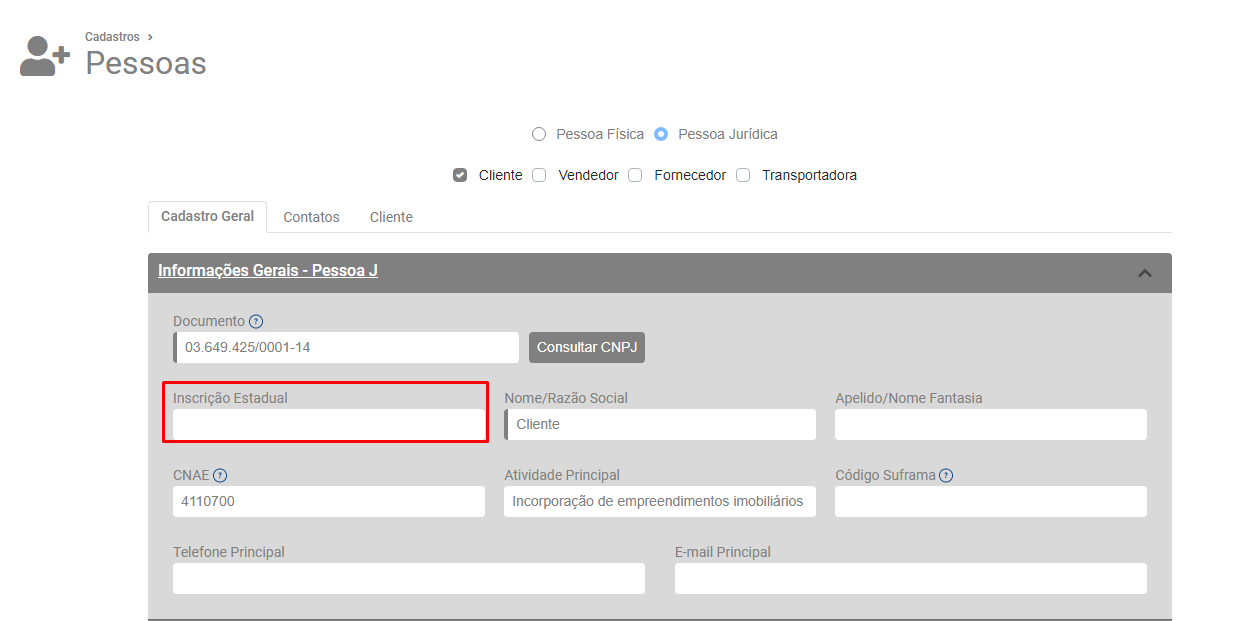 Preencha corretamente a informação do campo Inscrição Estadual da aba Cadastro Geral