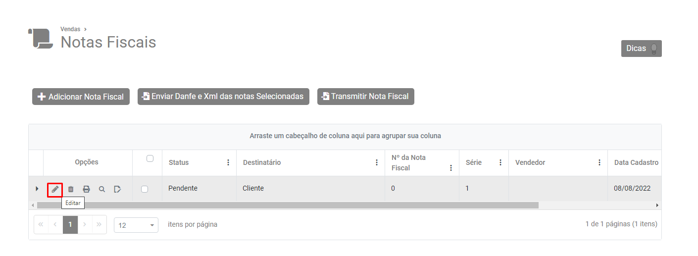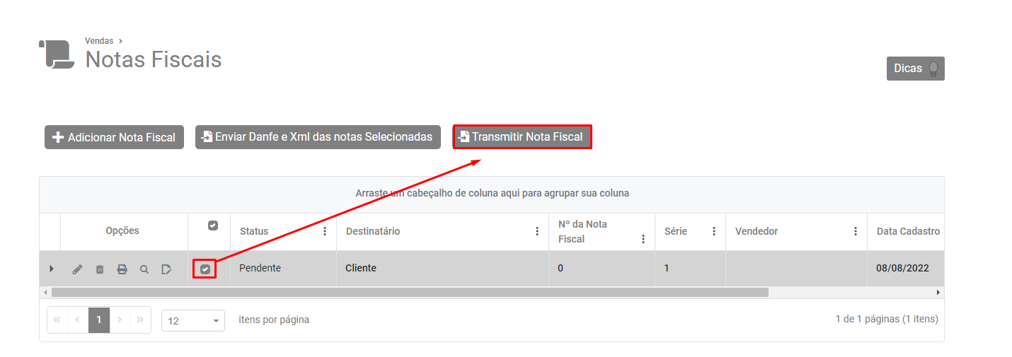 Selecione a nota no Grid e clique em Transmitir Nota Fiscal.
