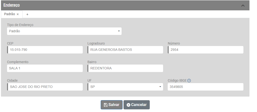 Acesse o campo Endereço e confira as informações de todos os endereços cadastrados para a empresa (padrão, entrega, cobrança, outros, etc)