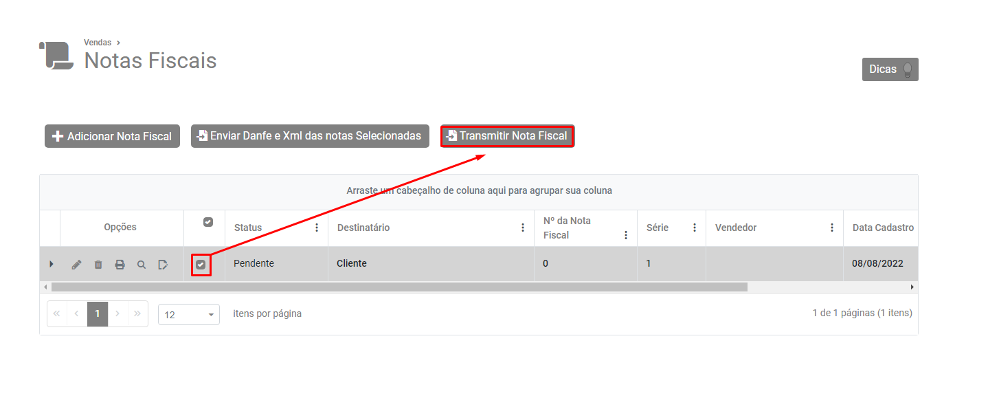 Selecione a nota e clique no botão Transmitir Nota Fiscal
