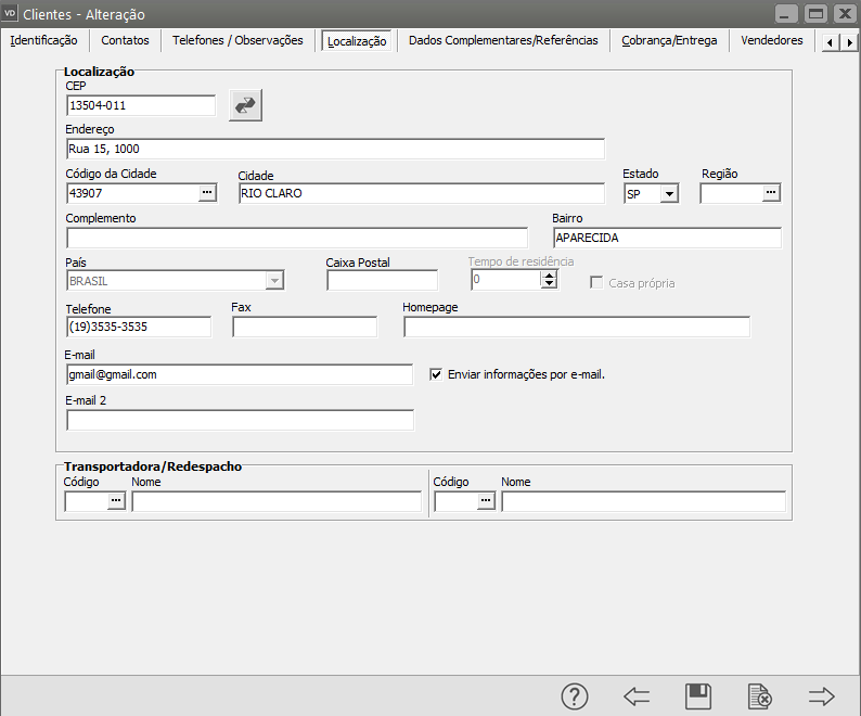 Manutenção>Clientes>Manutenção, pesquise pelo cliente e clique na seta Avança, em seguida acesse a aba Localização e confira todas as informações cadastradas no endereço do cliente